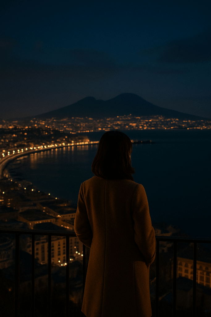 遠くにヴェスヴィオ山がぼんやりと浮かび、港の灯りがその稜線を照らしていた。