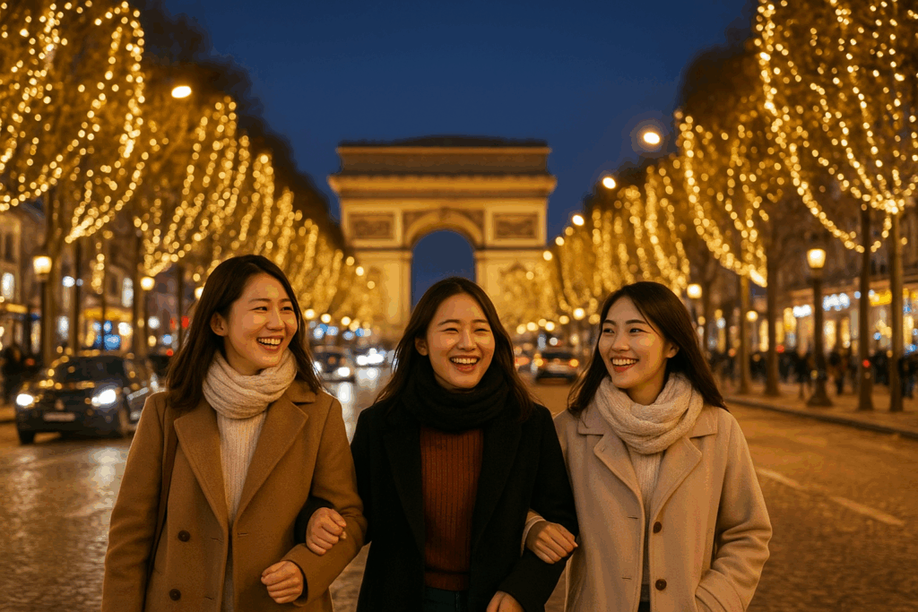 到着した日の夜、タクシーの窓から見えたのは、まるで星空が地上に降りたようなシャンゼリゼ通り。並木道に飾られた数十万のLEDが街全体を包み、遠くに浮かぶ凱旋門のシルエットが誇らしげに輝いていた。